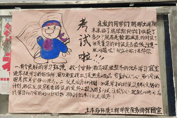 在6月初,土木与环境工程学院就分阶段、分层次召开学风、考风建设动员会。向辅导员、教师布置学院考风建设工作,强化班级管理,引导学生抓好最后的复习时间,认真备考。各班级陆续召开了“认真复习、积极备考、诚信应考,再创佳绩”的主题班会。利用本次班会,辅导员结合市场需要、应用型人才的培养目标,引导学生破除六十分万岁等消极观念,鼓励学生以积极地心态为大学的学习生活留下浓墨重彩的一笔。同时对本班学生开学以来存在的问题和违纪现象进行全面总结,组织学生学习学位授予条例和学籍管理规定。使学生思想上重视学习,重视学校的规章制度,从而为良好考风的形成打下基础。