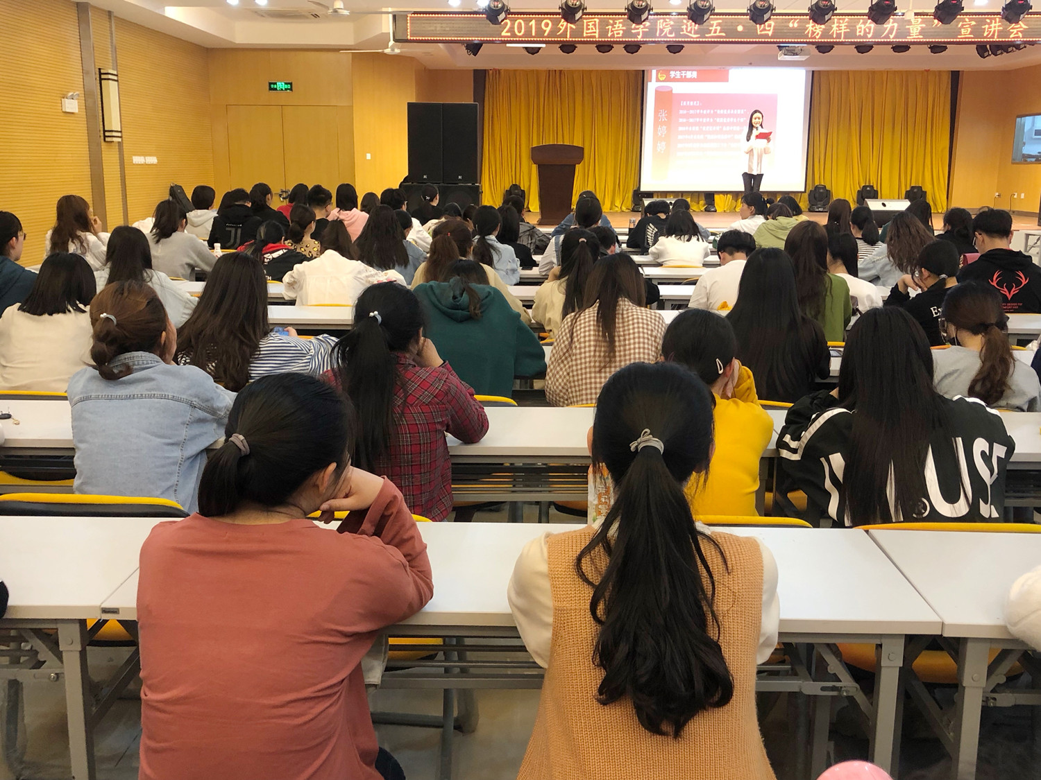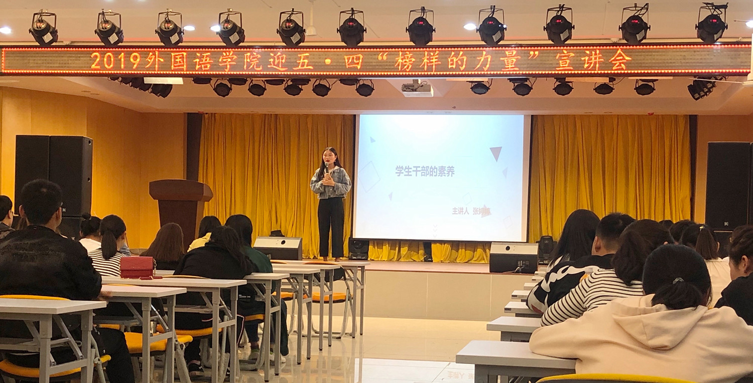 本网讯(通讯员:陈丽 )喜迎“新中国成立70周年”,纪念“五四运动100周年”,树立优秀大学生典型,4月16日, 外国语学院于在三期小礼堂举办了“榜样的力量”宣讲会。参加本次宣讲会的优秀代表有学生干部类榜样张婷婷、学科竞赛类榜样徐叶琴、志愿服务类榜样孙丽华、考研就业类榜样秦梦玲。
