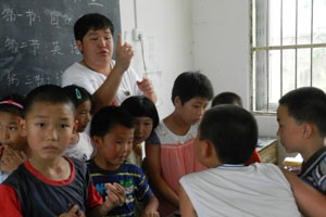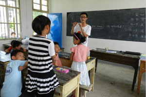 爱心课堂的教室中来了一位大朋友,原来是一个孩子的父亲闻讯前来听课。课间,队员们与这位家长进行交流,了解了当地留守儿童家庭的情况和造成留守儿童问题的成因。