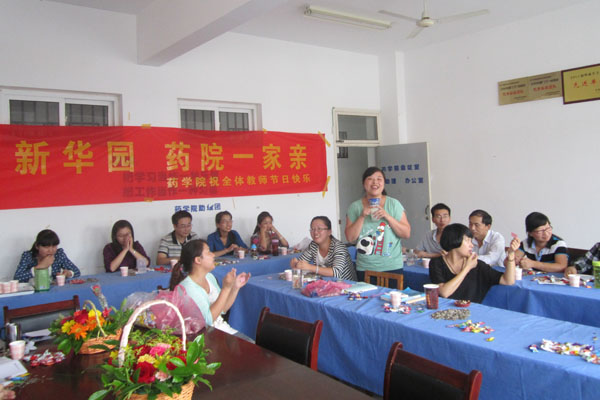 9月10日下午,药学院全体老师集聚一堂组织开展了别开生面的座谈会,庆祝自己的节日。座谈会上,首先,药学院副院长王飞转达了新华集团及安徽新华学院致全体教职工教师节的慰问信。药学院学生给老师送来鲜花表达对老师的祝福,院长张国升教授还为在场的每一位老师送上一杯热茶祝全体老师节日快乐。