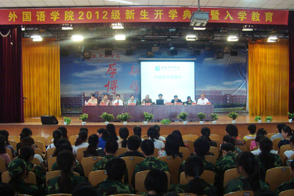 9月5日下午,外国语学院在学校大礼堂召开2012级新生入学教育暨开学典礼级,外国语学院院长任静生教授指出,大学阶段的学习是高层次的学习,有着自身的特点和规律,他要求同学们脚踏实地从一点一滴做起,调整心态用自信来迎接大学生活的新起点。