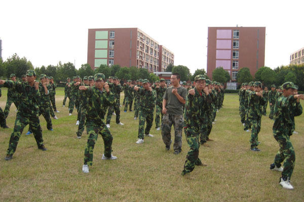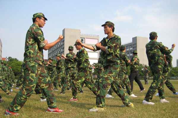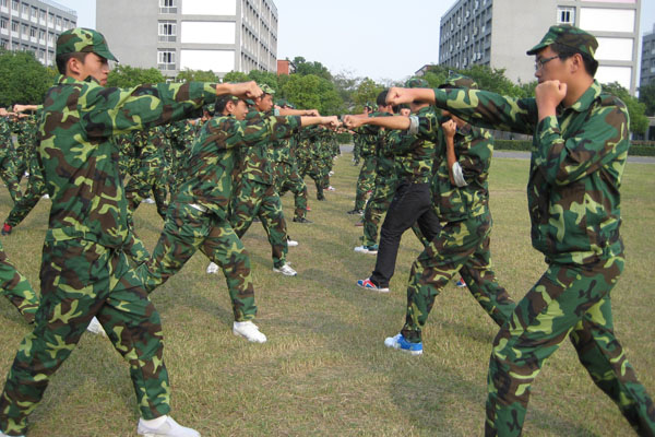 随着“格斗、准备”口令的响起,信息工程学院的男生们都摆出了标准的格斗姿势,他们承担着2012级军训汇报演出中“格斗士”汇报表演,因此每个连队的男生们都在勤学苦练每一招、每一式。在训练场地,你会发现这样一个特殊的场景:有两个连队是面对面的进行训练,这是教官特意安排的。有竞争才会有动力,两个连面对面一站,不服输的气势就体现出来了。刚一交锋,就比试起来哪个连队的口号更响亮,哪个连队的姿势更标准,甚至哪个连队的步伐更一致。两个连队之间在竞争,可是连队内部又是团结的,这无形中营造出了一种在竞争中团结,在团结中竞争的好氛围。两个连队的年轻“战士们”都干劲十足,相互比拼,力争完美。教官在训练中穿插着小游戏,把每个学生的积极性充分调动起来了,一天下来,大家都很累,但是收获很多。