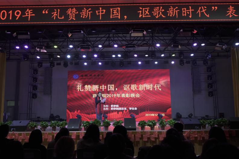 本网讯(通讯员:赵影、严兰梦)药学院2019“礼赞新中国,讴歌新时代”表彰晚会于12月5日晚上在校大礼堂举行。出席本次活动的有合肥高新区梦城区副主任李权,合肥高新区汇爱公益服务发展中心主任姬国印,杭州中美华东制药有限公司大区经理沈宇生,安徽新华学院学生处副处长王飞,药学院院长张国升,执行院长黄德垚,行政副院长余立新以及药学院全体教师。