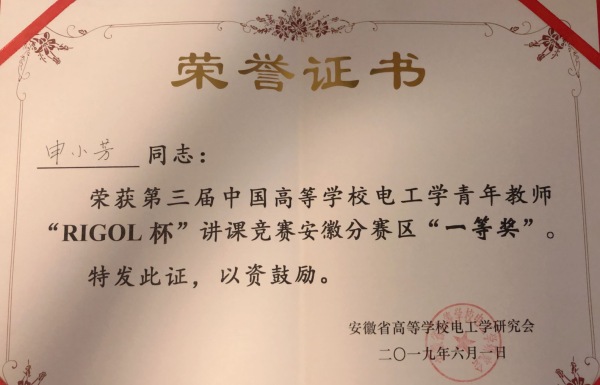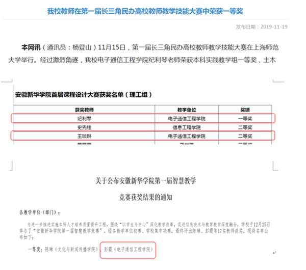 本网讯(通讯员:李文谨)2019年,电子通信工程学院教师在一系列省校级教学比赛中喜报频传。第一届长三角民办高校教师教学技能大赛纪利琴荣获一等奖;安徽省第二届移动教学大赛苏巧平老师荣获二等奖;第三届中国高等学校电工学青年教师“RIGOL杯”讲课竞赛申小芳、王琰琳老师荣获安徽赛区一等奖;安徽新华学院首届课程设计大赛纪利琴、王琰琳老师分别获得理工组一、二等奖;安徽新华学院首届“智慧课堂”比赛彭霞老师荣获一等奖等。