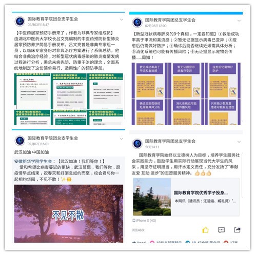 国际教育学院团总支利用读原文、看视频、听音频等形式开展防控疫情知识线上专题学习,及时传达防疫知识,准确宣传防疫手段,以团支部为单位每日汇报自身健康情况。通过在线宣传科学防控知识,为防疫工作大局作出应有的贡献。