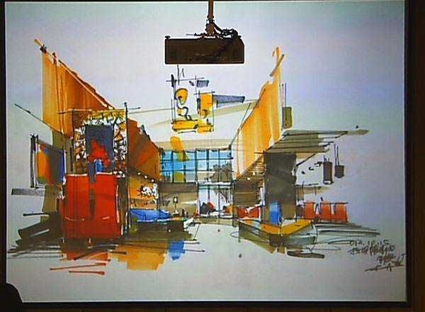 讲座开始,杨健开篇点到了“美”,并切中时弊的指出了当前审美的问题,并强调点出手绘可以培养审美情趣、创造美的过程,重点谈到艺术可以成为文明演进的推动力,可以再创造美的过程中,促进社会和谐;在列举了国际国内著名艺术大师的作品并点评之后,从构图、技法等方面全面阐述了艺术创作的陈设之美、表现形式之美、悲壮之美、色彩之美等,从美学原理的角度剖析了手绘的内涵;特别从手绘的自然情趣方面着眼,并与大家分享了最前沿的手绘设计理论概念。并在现场创作了手绘作品“客厅”。