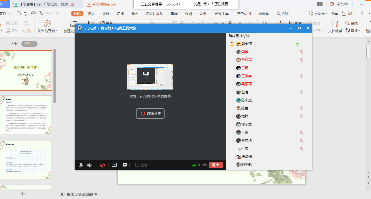 本网讯:通讯员(肖华君)为切实保障停课不停学,做好新冠肺炎疫情防控期间线上开学组织工作。近期,商学院各个班级在辅导员的组织下,陆续通过微信、腾讯会议等网络平台召开新学期第一次线上主题班会。