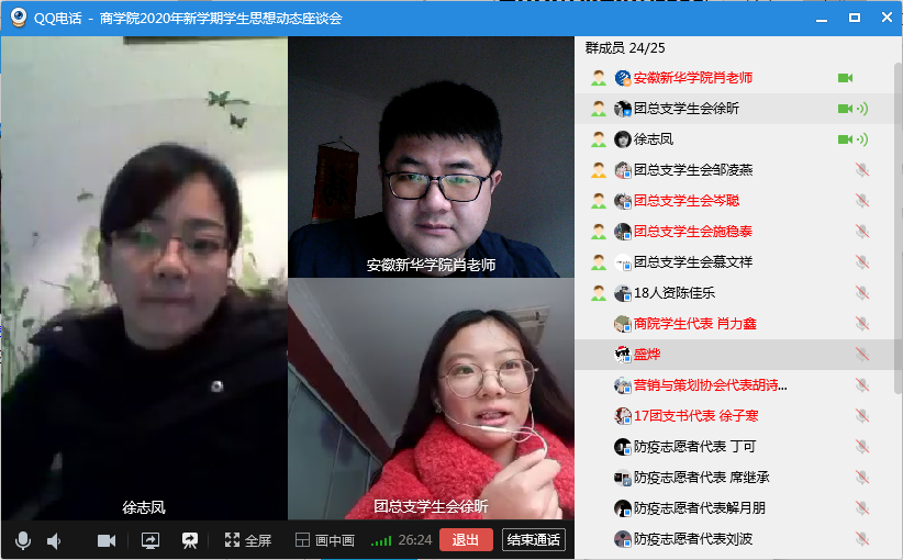 会上,肖华君向同学们传达了学校的关心与关爱,解读了学校疫情防控相关政策与文件。首先,参加防疫工作的志愿者代表们分享自己的防疫工作经验,动员同学们从自身做好防疫并向家中长辈积极宣传防疫知识,体现当代大学生的责任和担当。学生代表们主要围绕当前疫情防控我国取得的重大成效、线上开学上课的优势和存在的问题、我校20周年校庆活动的建议等方面展开讨论。与会老师对各位同学的健康状况、思想动态、考研就业情况、毕业设计进展等情况进行了一一了解,并耐心解答同学们的提问。随后,肖华君代表团总支提出4点要求:1、持续重视疫情防控,每天按时在“皖校康”小程序中反馈身体状况。2、积极发挥共青团员和大学生党员的先进作用,传播好声音。3、是高效合理安排作息时间,认真参加线上学习。4、克服焦躁、不安等消极情绪,牢固树立战胜疫情的信心。