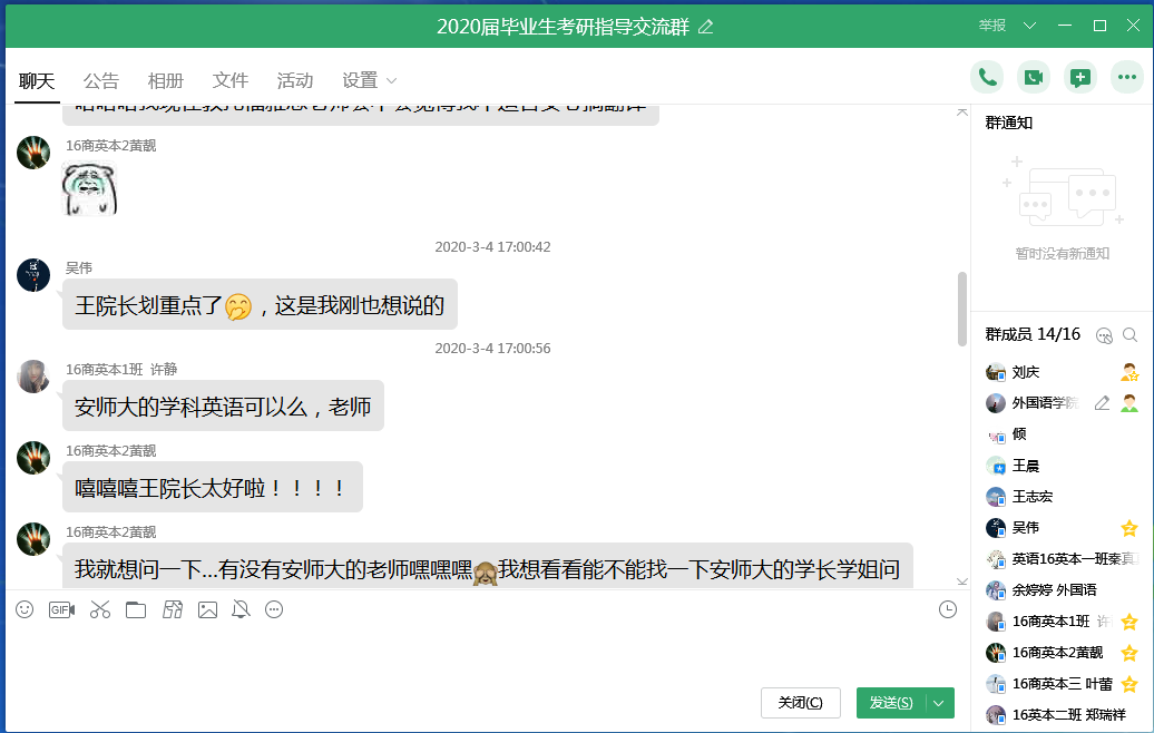 考研毕业生们针对目前存在的问题和复试的盲区,都在会议群中积极提问,各位老师都进行了解答,并将相关指导材料发给了大家。