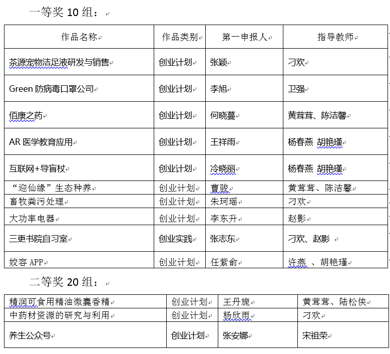 本网讯(通讯员:赵影)药学院高度重视培养在校大学生的创新创业意识。2月,新冠病毒疫情期间,响应党中央停课不停学的号召,药学院在严抓线上教学质量的同时,高度重视学生第二课堂综合素质提高,在全院范围内开展创青春比赛,学工人员各班级内进行广泛宣传,鼓励同学们积极参赛,全体教师参与竞赛指导。药学院院赛参赛人数达300人,共组队50组。通过评委的线上打分综合评定后,遴选出十组参加校级比赛。院赛评选出一等奖、二等奖和三等奖团队。获奖组别分别为: