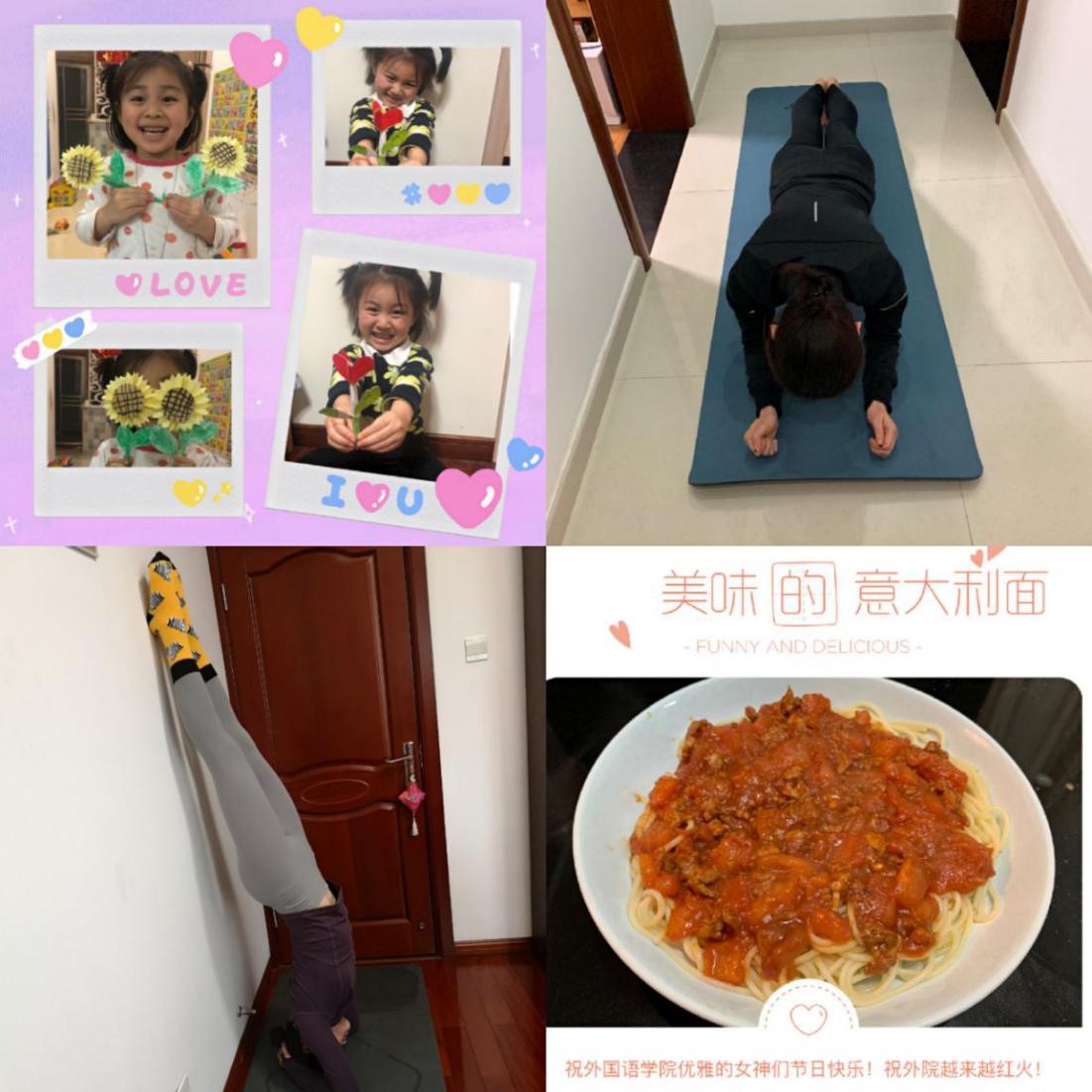 自3月7日-8日活动开展以来,外国语学院的女教师们响应号召,用制作美食、分享手工、强身运动等不同的方式,居家进行了一次有意义的互动体验,缓解情绪,释放压力,坚定抗疫信心,同时也为仍战斗在一线的巾帼英雄们送去祝福和祈愿。