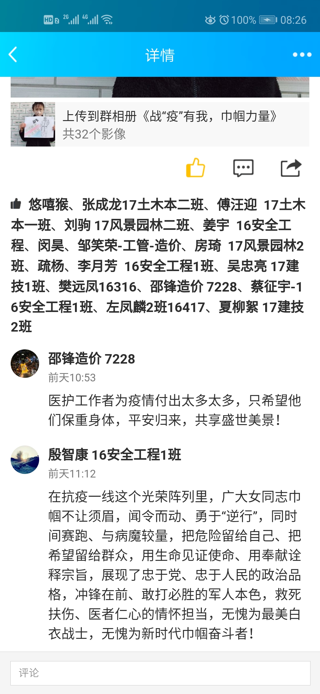 本网讯(通讯员:赵群)在全国万众一心抗击新冠肺炎疫情的关键时期,又值第110个“三八”国际妇女节来临之际,土木与环境工程学院学生第一党支部开展纪念“三八”国际妇女节活动,采用线上的方式,过别样的“云妇女节”,齐心协力为疫情防控献上满满正能量。