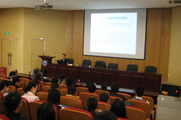 徐峰的报告分为证券行业信息化的概况、证券行业信息化的特点和新信息技术的应用三部分。从行业应用的角度,详细讲解了系统架构、网络架构、数据挖掘、金融工程、云计算、移动技术及安全技术的具体应用。最后还就学生关心的问题进行了耐心、专业的解答,告诫同学们要加强数学、计算机及金融知识的学习,为以后深造或从事证券类工作打下坚实基础。