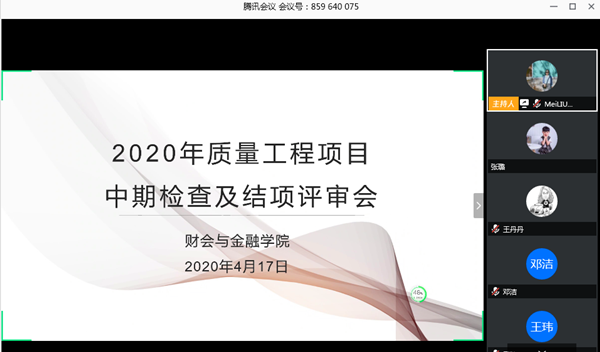 本网讯(通讯员:刘妹)根据安徽新华学院《关于开展国家级、省级、校级“质量工程”项目年度检查验收工作的通知》文件要求,为进一步加强省校级各类“质量工程”项目建设与管理,更好地推进各项目的顺利实施,提高各项目检查验收的质量,财会与金融学院聘请合肥学院魏朱宝教授担任评审组组长,杜俊娟等6名高级职称教师担任评审组成员,4月17日下午,通过腾讯会议平台财会与金融学院组织召开了2020年“质量工程”项目评审会议,财会与金融学院各项目负责人参加了此次会议,会议由蔡冬梅主持。