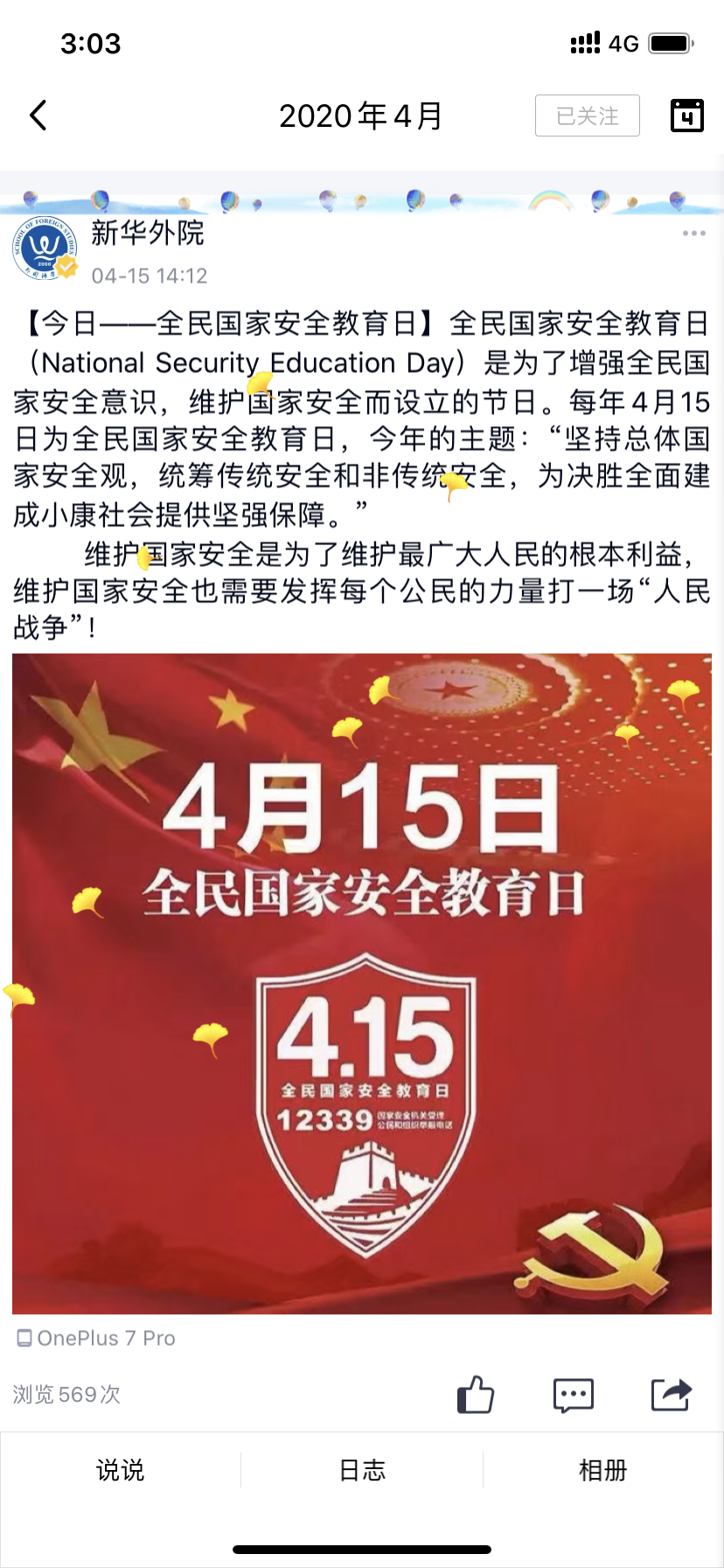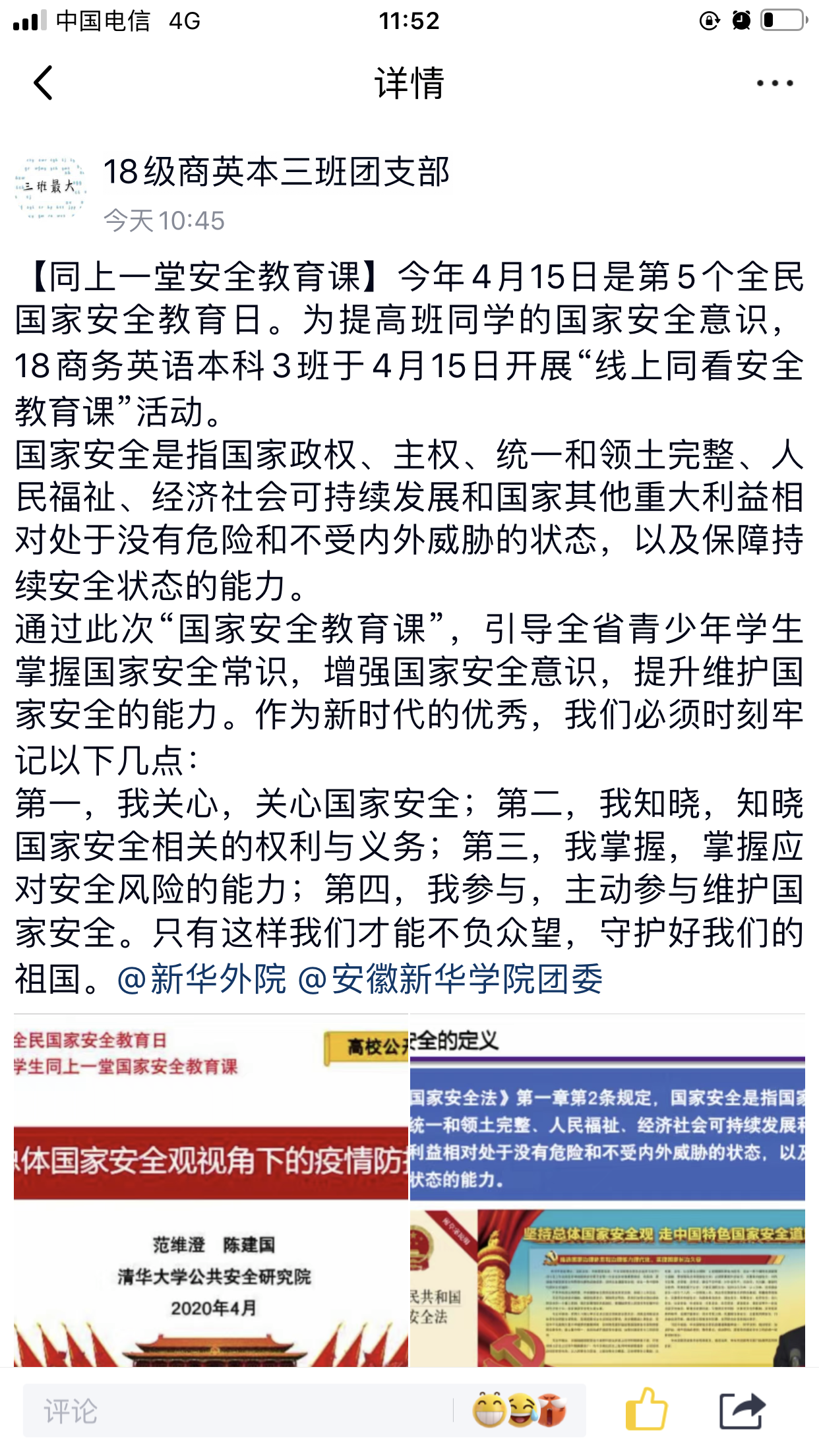 自4月14日开始,我院利用官Q、官微及学生各团支部的官方公众号积极转发国家安全教育日的相关视频、图片及文字,利用新媒体平台,进一步营造宣传氛围,确保良好的教育效果。