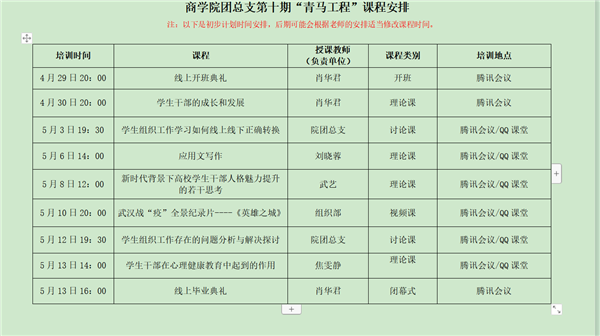 本届“青马工程”培训班将在商学院党总支和团总支的指导下,将传统培养方式与当前互联网在线教学活动相结合,对学生骨干进行重点培养,发挥培养对象在学生中的榜样引领作用,以点带面,将习近平新时代中国特色社会主义思想作为思想武器和行动指南,结合疫情防控攻坚战有利成果,在学习互助中认识青年担当,凝聚青年力量,成长为一名合格的社会主义建设者和接班人。