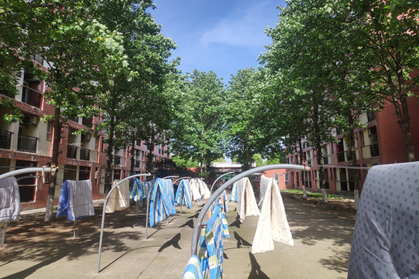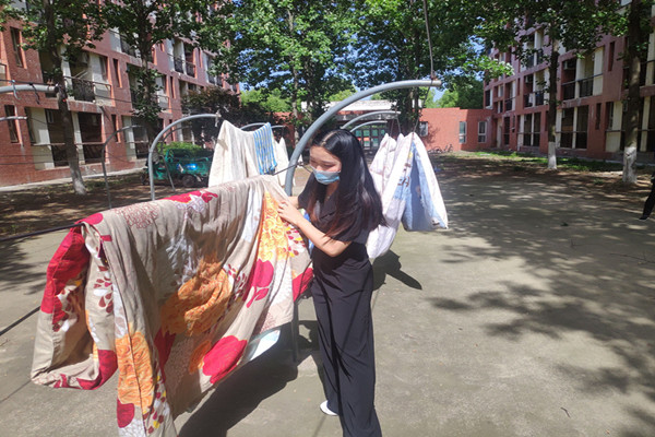 5月12日中午,电子通信工程学院辅导员们纷纷行动起来,为学生晾晒被褥。他们清理、擦拭晾衣绳,从晒到收,从楼上到楼下,时不时地“敲敲打打”、“翻个身”。为防止被子晒后放错位置,细心的老师们还在被子上贴上信息签,楼栋号、宿舍号、床位号等信息一目了然。