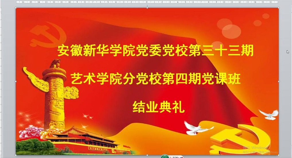 本网讯(通讯员:高扬)6月29日,安徽新华学院第三十三期艺术学院分党校第四期入党积极分子培训班结业典礼于腾讯会议线上举行。艺术学院党总支书记许存福、艺术学院党总支副书记彭智、艺术学院党总支纪检委员余新泳、艺术学院党总支宣传委员刘刚、艺术学院党总支组织员张大勇、艺术学院第一学生党支部书记张小菊及本期培训班全体成员出席了本次结业典礼,会议由艺术学院第二学生支部书记、本期党校班主任高扬主持。