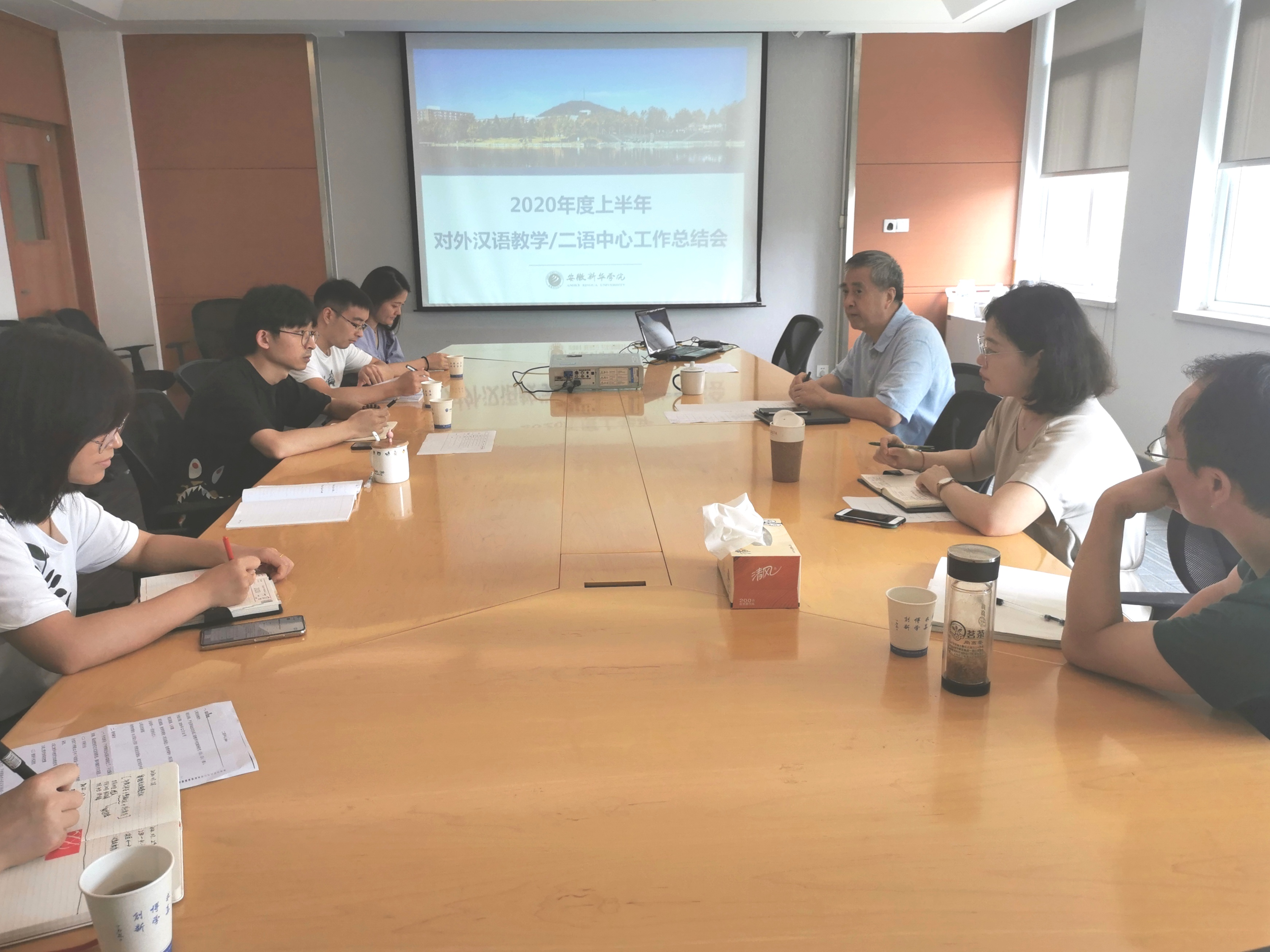 本网讯(通讯员:石丽丽)为了总结本学期我校汉语教学及汉语作为第二语言教学研究中心工作,同时合理布置下半年的工作。2020年7月31日上午在国际教育学院会议室召开了工作会议,国际教育学院院长范东生、院长助理黄喆、对外汉语教研室以及二语中心全体成员参会。