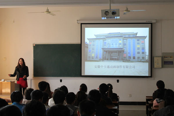 招聘会首先由中卡通集团人力资源部主任郑会会给同学们作了简单的介绍,展示了中卡通公司的发展历程,公司的部门和技术人员,播放了中卡通公司自主创新的代表作《九华小和尚》,以及其自主开发的动漫类衍生产品。目前中卡通公司已被选为第三批省文化产业示范基地之一。这也是中卡通公司跟我校动漫学院校企合作的第三个年头,他们对动漫学院历届毕业生的评价很高,认为我校学生综合素质比较好,在专业知识和动手能力方面有非常出色的表现。