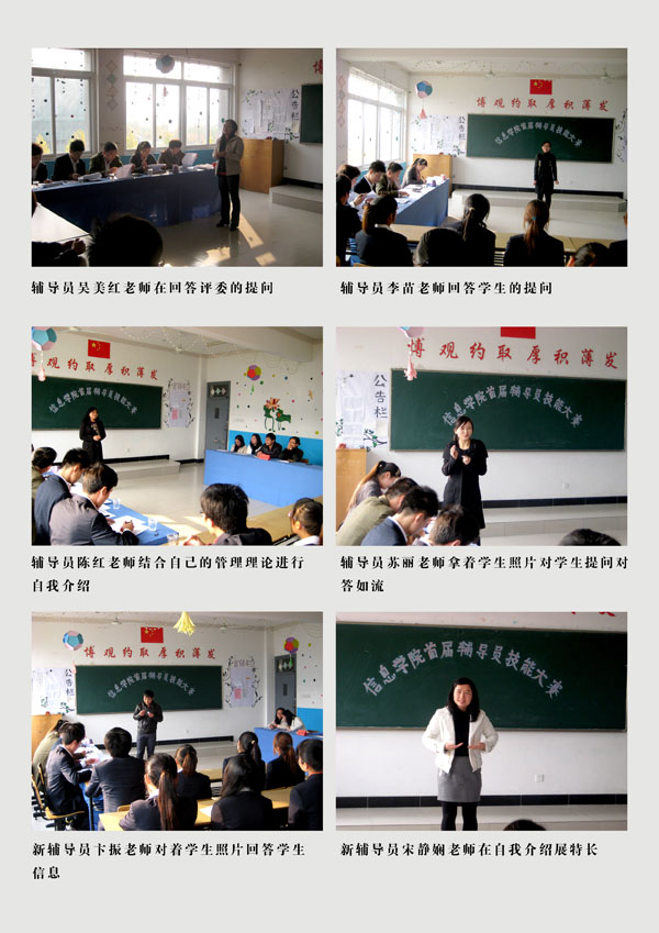 比赛共分3个环节,包括:自我介绍与展示,即辅导员对个人情况和工作中的特色之处进行介绍与展示;班情掌握,即评委随机抽取三个学生的照片,辅导员须答出他的专业、政治面貌、籍贯、住宿情况等九项基本信息;基础知识测试,以《安徽新华学院辅导员工作手册》为内容,以闭卷、笔试的方式进行测试,有专人负责监考。