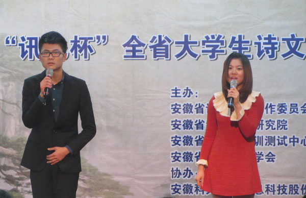 “讯飞杯”全省大学生诗文朗诵比赛,由安徽省语言文字工作委员会办公室、安徽省教育科学研究院、安徽省普通话培训测试中心于2006年创办,安徽科大讯飞信息科技股份有限公司协办。这项活动多年来受到了全省高校、测试站的高度重视和大力支持,以及广大青年学生的积极响应和热情参与。此次比赛分为复赛和决赛两个环节,复赛阶段全省各高校报送朗诵作品76件。10月下旬,大赛组委会组织专家对选送作品进行了认真审听、打分,最终确定26件作品入围。文化与新闻传播学院高度重视此项比赛,精心组织,细致策划,对爱好诗文诵读的学生进行遴选,安排王群芳老师、马兰老师进行了全程指导。