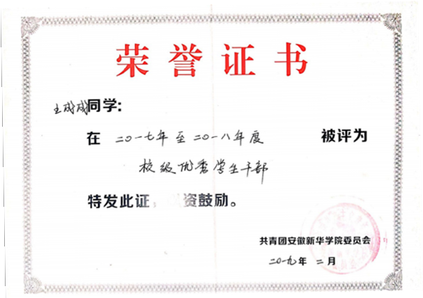 王成成同学生活勤俭,奖学金总是省下来给父母治病。作为寝室长的他,关心同学,引导同学树立正确的三观,在他的带动下班级同学争做新时代好青年,其中,5名同学被学校、社区评为“优秀志愿者”称号。