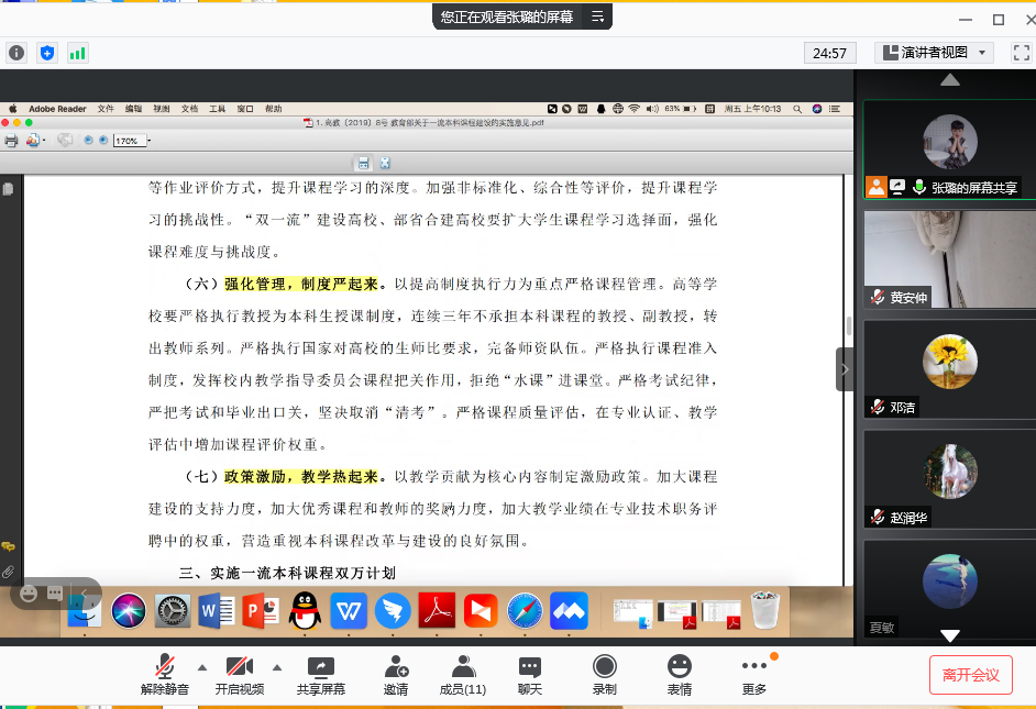 会上,张璐首先对国家级一流本科课程申报的相关政策和评审指标等文件进行了详细解读,并通过梳理2019年国家级一流本科课程获批的数据,就今年申报的整体情况进行分析,并对相关申报条件、注意事项等进行说明。
