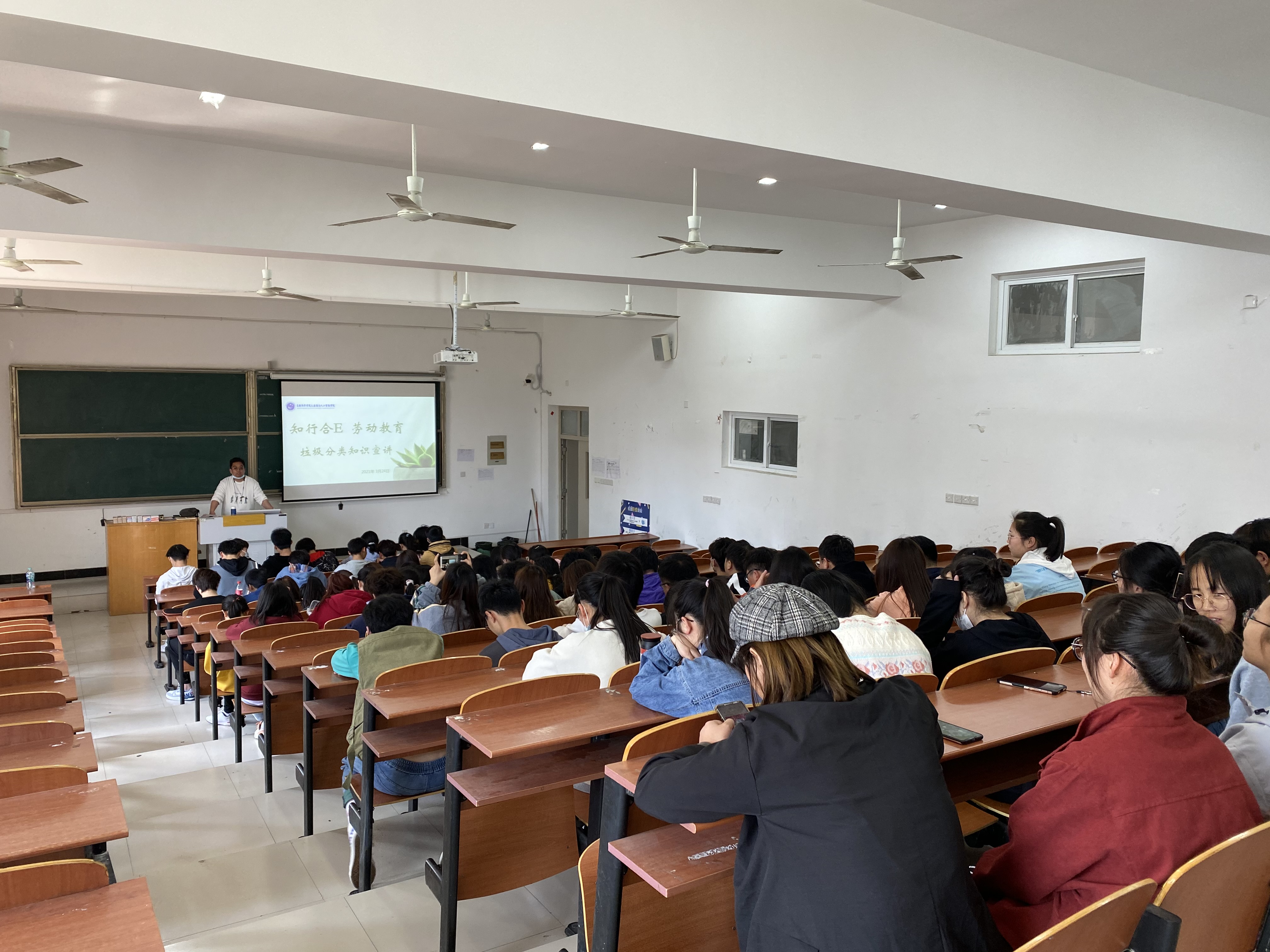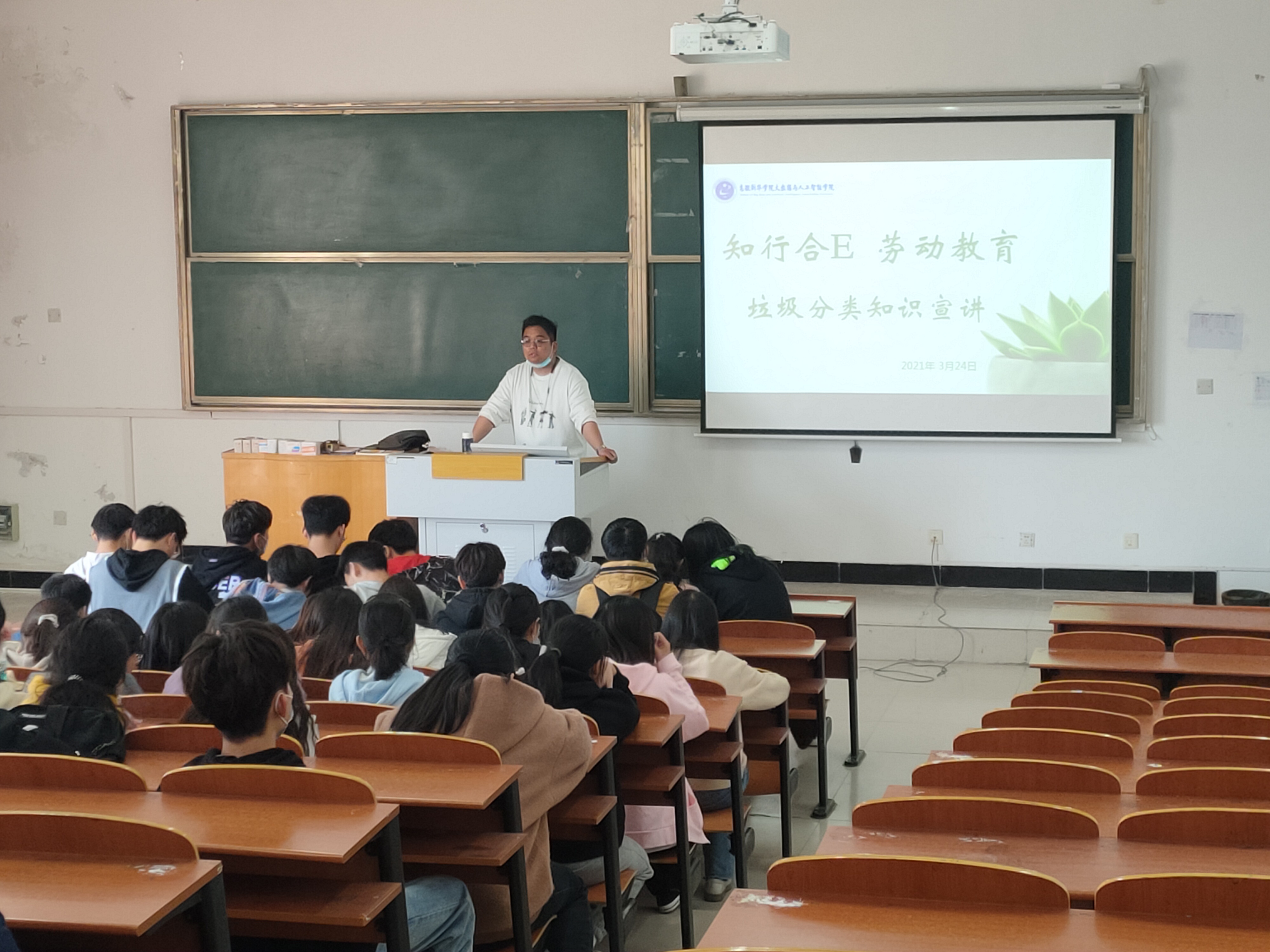 本网讯( 通讯员:张雨)为弘扬劳动教育,教育引导学生崇尚劳动、尊重劳动,同时进一步提高学生垃圾分类的意识,3月24日下午,大数据与人工智能学院邀请合肥市绿迹环保公益中心宣传部部长王清宇,在教学13号楼302教室开展“知行合E”劳动教育之垃圾分类知识宣讲会,参加本次会议的有大数据学院团总支书记周刘湘及来自院内各班级的百余名志愿者。