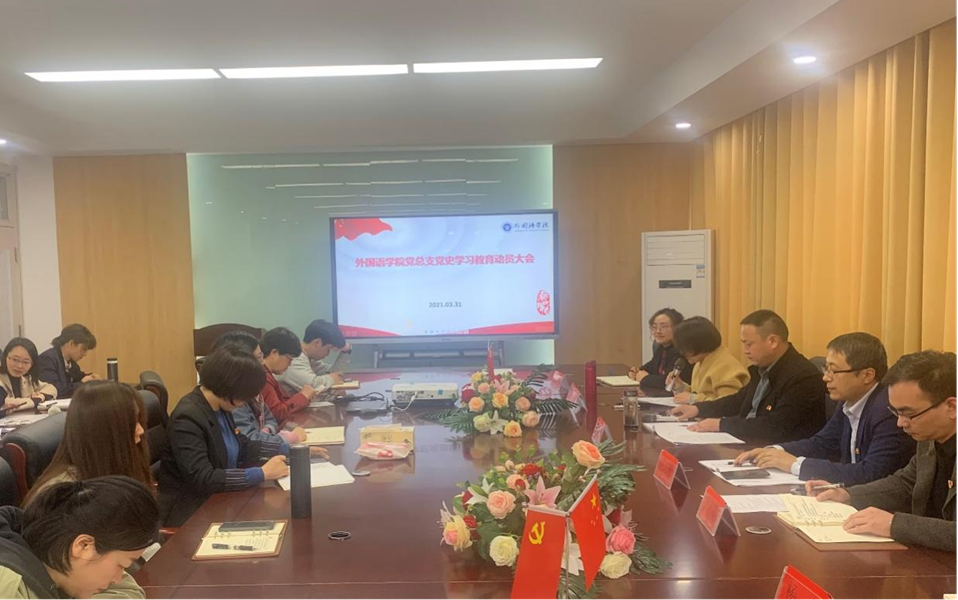 本网讯(通讯员:郭晓菊)3月31日,外国语学院在324会议室召开外国语学院党总支党史学习教育动员大会。党总支副书记杨光、副书记陈丽、纪检委员王志宏、组织委员郝亮、宣传委员郭晓菊、青年委员杨静、群工委员兼组织员李靖、全体教师党员及学生党员参加会议,会议由党总支副书记陈丽主持。