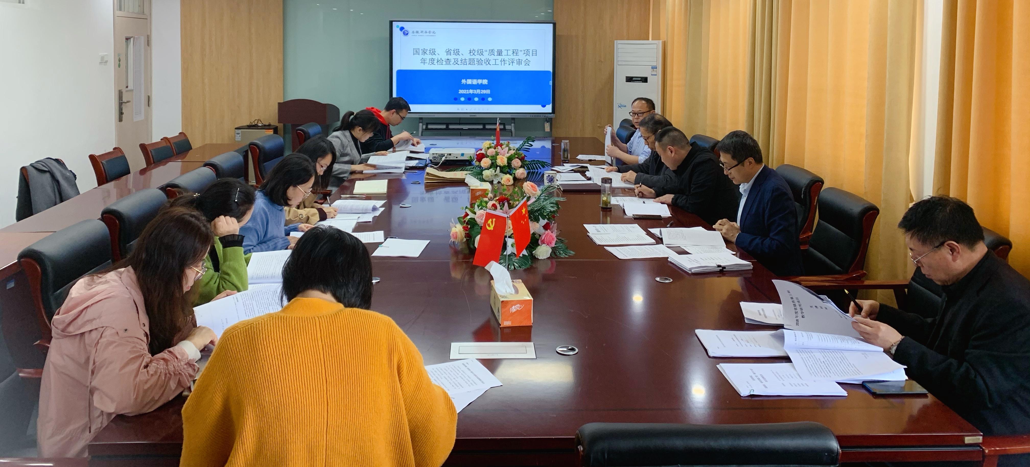 本网讯(通讯员:佘月月)近日,学校教务处下发了《关于开展国家级、省级、校级“质量工程”项目年度检查及结题验收工作的通知》(教字〔2021〕33号),根据工作安排,外国语学院于3月29日召开了“质量工程”项目年度检查及结题验收工作评审会。外国语学院院长张杰、副院长(主持)杨光、学科带头人周平教授、教学副院长王志宏、各系部主任、各科研团队负责人、科研秘书等参加了本次会议,会议由杨光主持。
