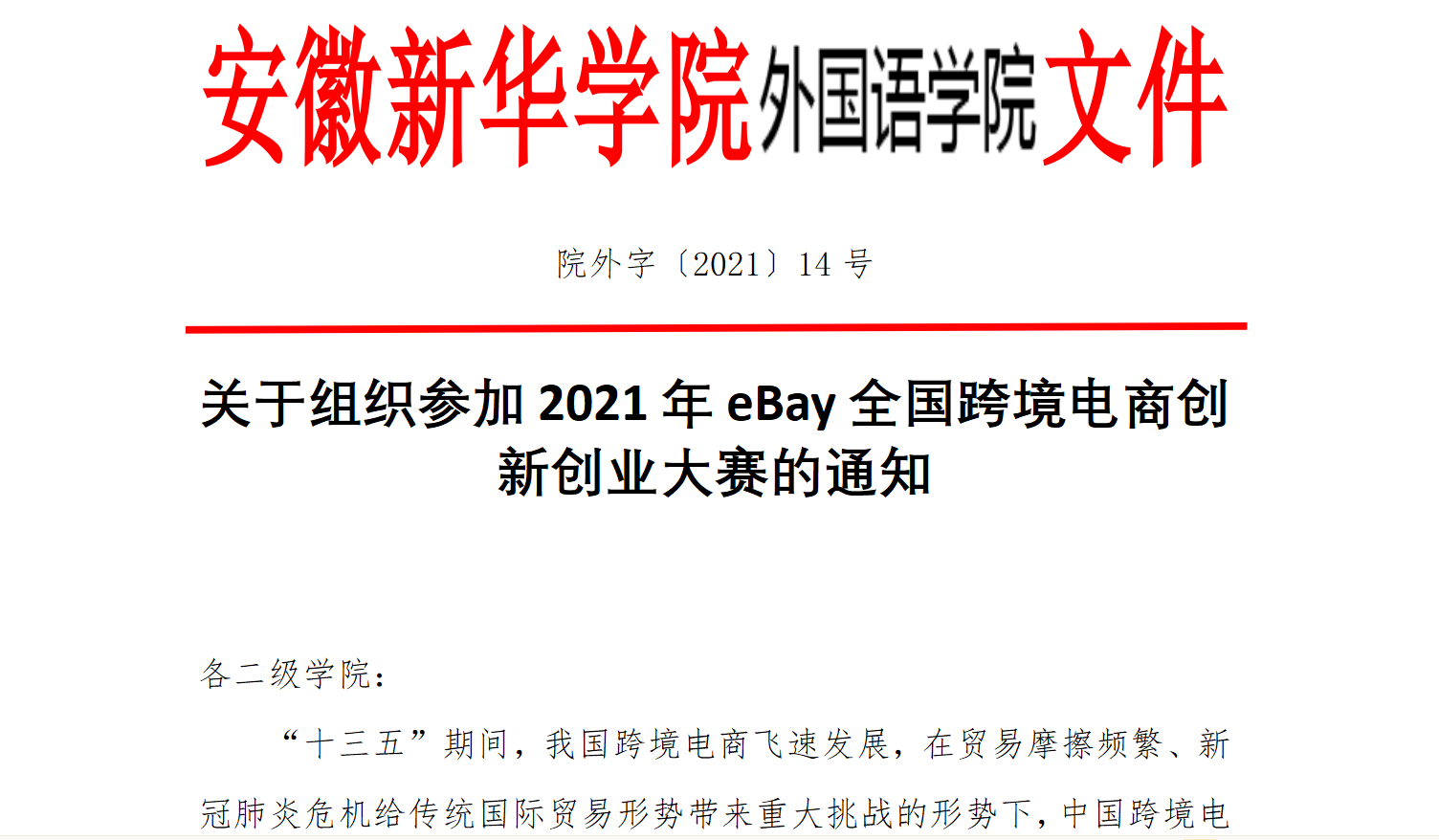 本网讯(通讯员:周晶,李怡嘉)为充分利用跨境电商的良好形势,推动跨境电商行业发展,培养培育跨境电商人才,助力数字经济增长,eBay公司联合全国各高校特举办2021年全国跨境电商创业创新大赛。我校为eBay安徽地区官方合作院校,由外国语学院负责该项比赛的校园报名、相关校企联络和技术协调工作。