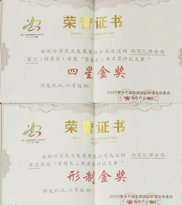 作为90后新型农民,王随新始终坚持茶园科学化管理和无公害种植,同时在岳西翠兰的制作工艺上精益求精。在今年举办的首届长三角名茶大赛上,雨思忆茶叶专业合作社选送的“雨思忆牌岳西翠兰”斩获“四星金奖”和“形制金奖”。