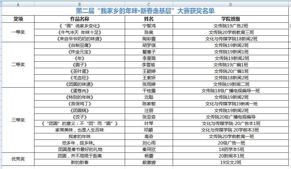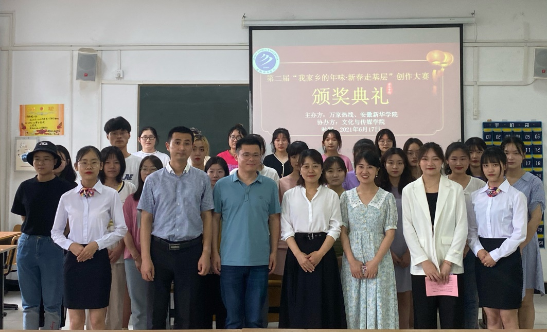 本网讯:(通讯员:胡梦琪)6月17日,第二届“我家乡的年味•新春走基层”创作大赛颁奖典礼在文化与传媒学院302教室举行。出席本次颁奖典礼的有文化与传媒学院教学副院长王鹏、行政副院长朱向群、新闻系副主任张倩、万家热线采编部主编孙阳杨及全体获奖学生。