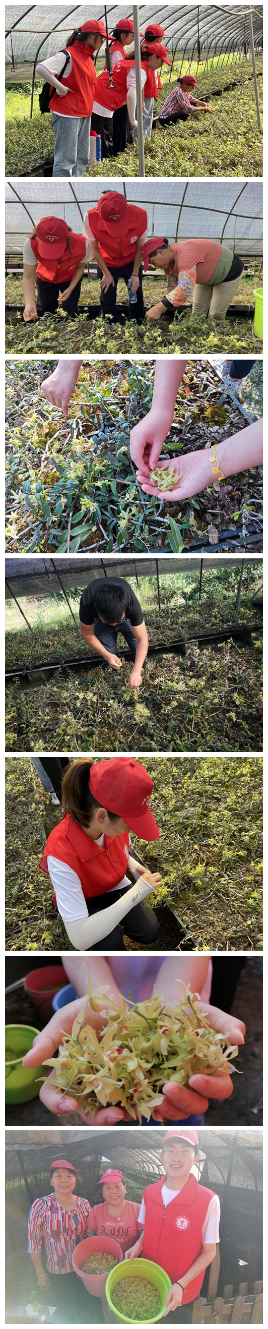 劳动是快乐的,有队员对石斛花观察得很细致,描述到花朵姿态玲珑优雅,色泽淡绿柔嫩,芬芳浓郁,香氲饶人,炎炎夏日,大棚内的温度更高,队员们汗水顺着发丝流下,脸上都刻着疲劳二字;劳作是辛苦的,队员们丝毫没有放弃的念头;劳动是光荣的,大家看着大棚内辛苦劳动的工作人员熟练轻快采摘,不时传来队员们羡慕的赞叹;劳动是幸福的,大家满意地抱着自己一桶桶的劳动成果,晚饭时,我们特地做了一盘石斛蒸蛋,鲜嫩爽口,真实体验到了劳动的成就感。