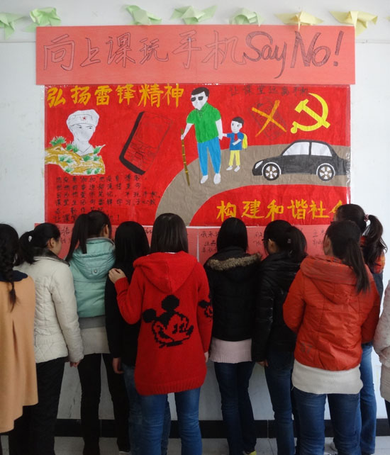 会上,辅导员老师宣读了《关于课堂关闭手机的倡议书》,并解读了课堂关闭手机的必要性和重要性。随后,2012级财管(4)班的同学们展开了积极讨论。车宝军同学说:“频繁使用手机,会导致视力下降,同时,手机还有辐射,会产生掉发、头晕、失眠、食欲不振等不良症状。刘婷婷同学说:“在课堂上使用手机,难免会制造一些声响,不仅影响周围同学学习,也影响老师的教学发挥。我们大家应该从现在做起,向上课玩手机say no,共同营造一个优良的学习环境。”