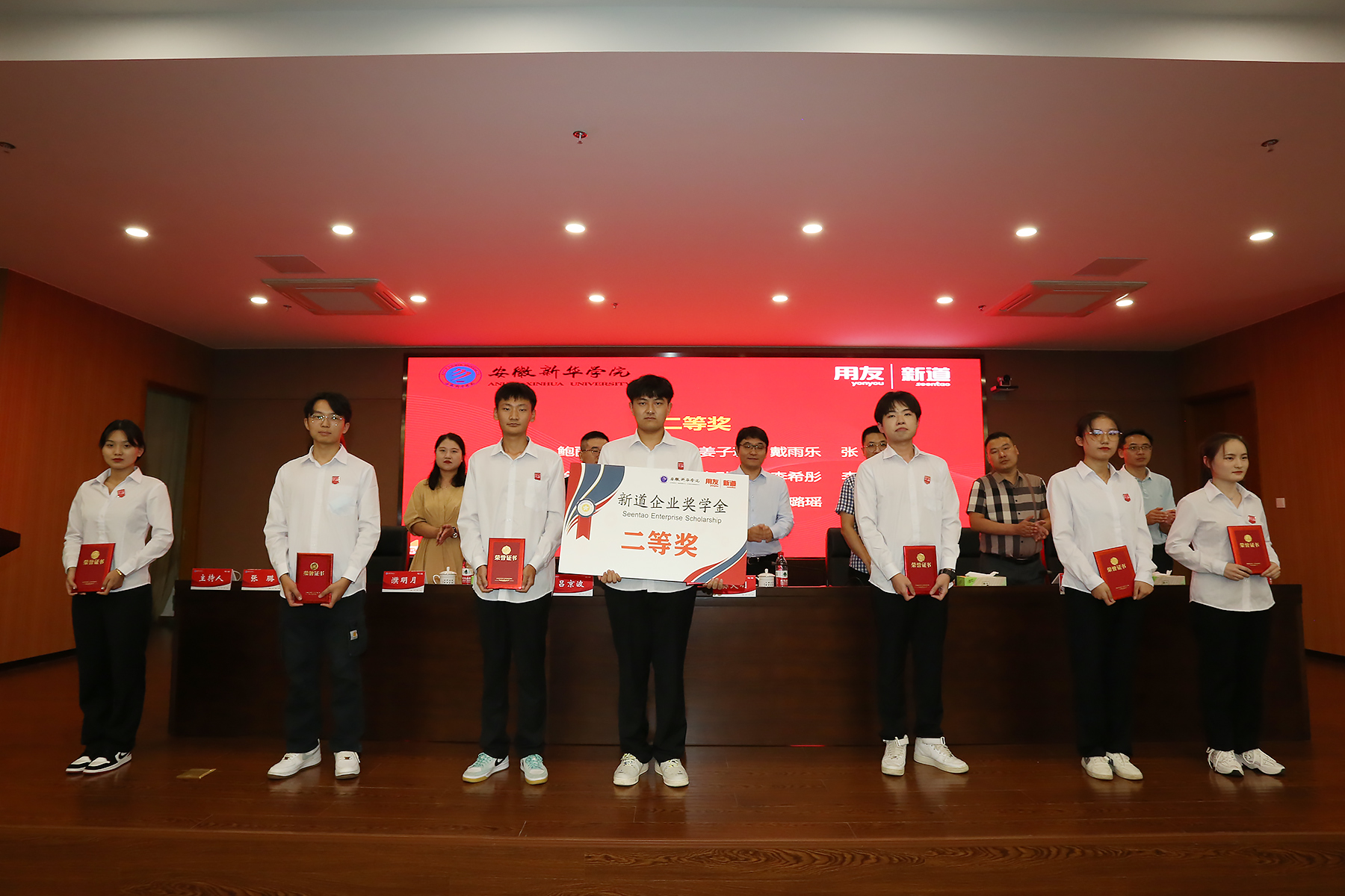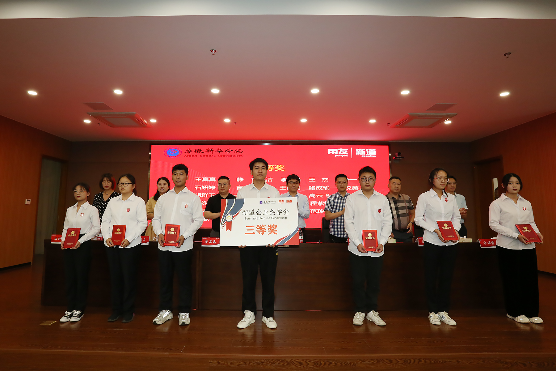 随后,吕京波宣读《关于授予谢晓雅等61名同学“用友新道”奖学金的决定》。校企双方领导为2019级、2020级共61名“用友新道”奖学金获得者颁奖,并为2021级新生代表授予“云财务管理会计师”专属徽章,鼓励全体新生在新学期取得更大进步。