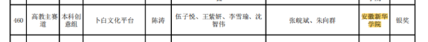 本届竞赛共有来自全省160余所学校、9万余个项目、近60万人次参赛,经过激烈的角逐,我校文化与传媒学院2019级汉语言文学专业陈涛、2019级汉语言文学专业伍子悦、2019级广播电视编导专业李雪瑜、2018级新闻学专业王紫妍、2017级广告学专业沈智伟同学的《卜白文化平台》项目荣获安徽省银奖( 指导教师为张皖斌、朱向群) ;2020级汉语言文学专业李金存、2020级汉语言文学专业张乐、2020级汉语言文学专业谢程程、2020级汉语言文学专业董莎莎、2019级广告学专业王秀玲、2020级药学专业张思懿、2017级国际经济与贸易专业王银银同学的《岳西草堂》项目荣获安徽省铜奖(指导教师为阳丽、汪恒宇)。