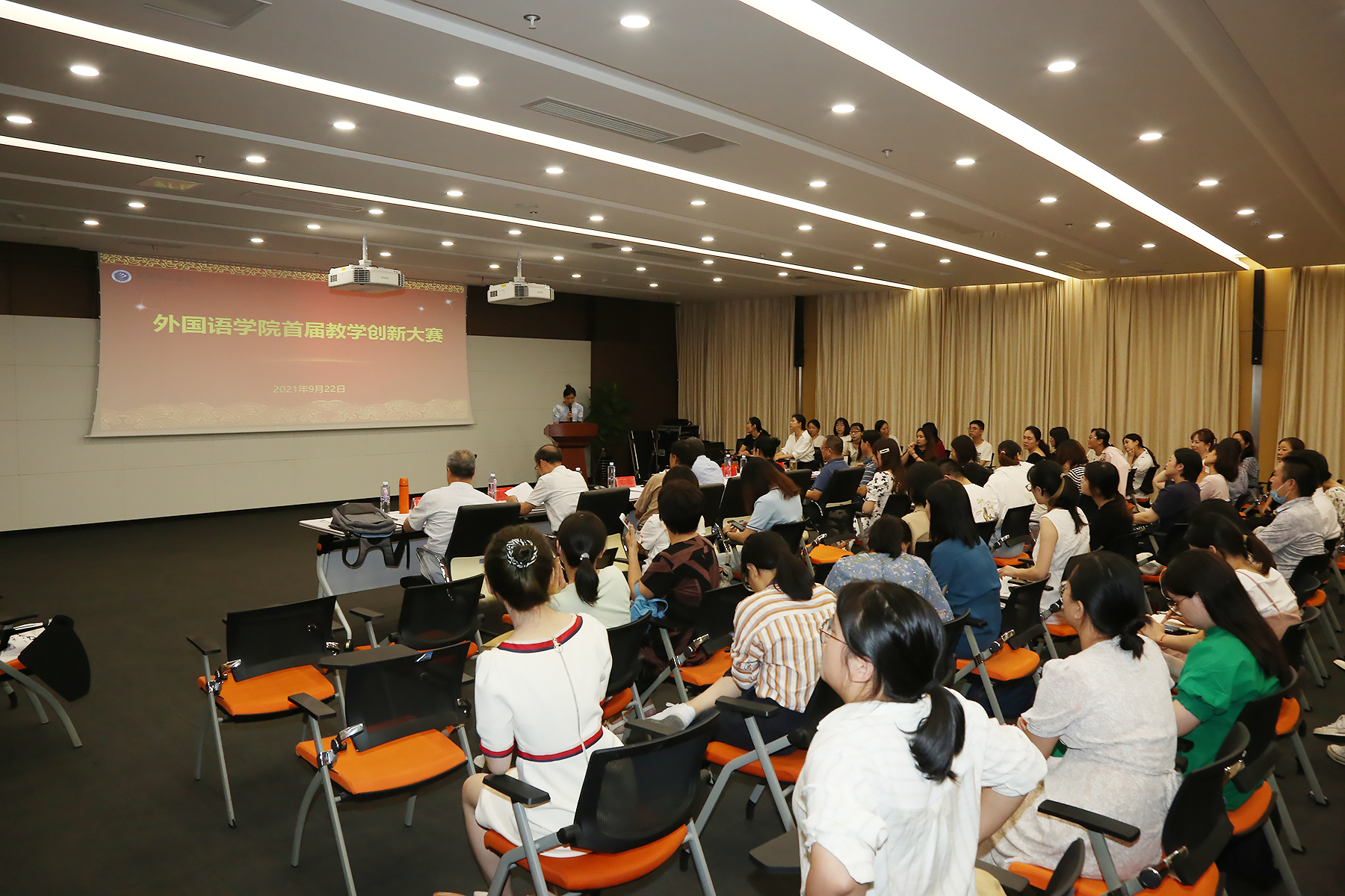 本网讯(通讯员:李怡嘉)为进一步加强外国语学院教师队伍建设,提升教师教学能力和业务水平,提高课堂教学质量,配合学校第二届教师教学创新大赛的赛前选拔工作,9月22日下午在科研楼一楼多功能室举行了外国语首届教学创新大赛。此次大赛特邀质量监控与评估处处长吴约,教务处副处长蔡冬梅,文化与传媒学院院长何村、外国语学院执行院长杨磊、院长张杰、顾问范东生、副院长周平等作为比赛的评委。经前期“自愿报名+统筹推荐”,现场参赛选手共9名,外国语学院全体教师观摩了此次比赛。