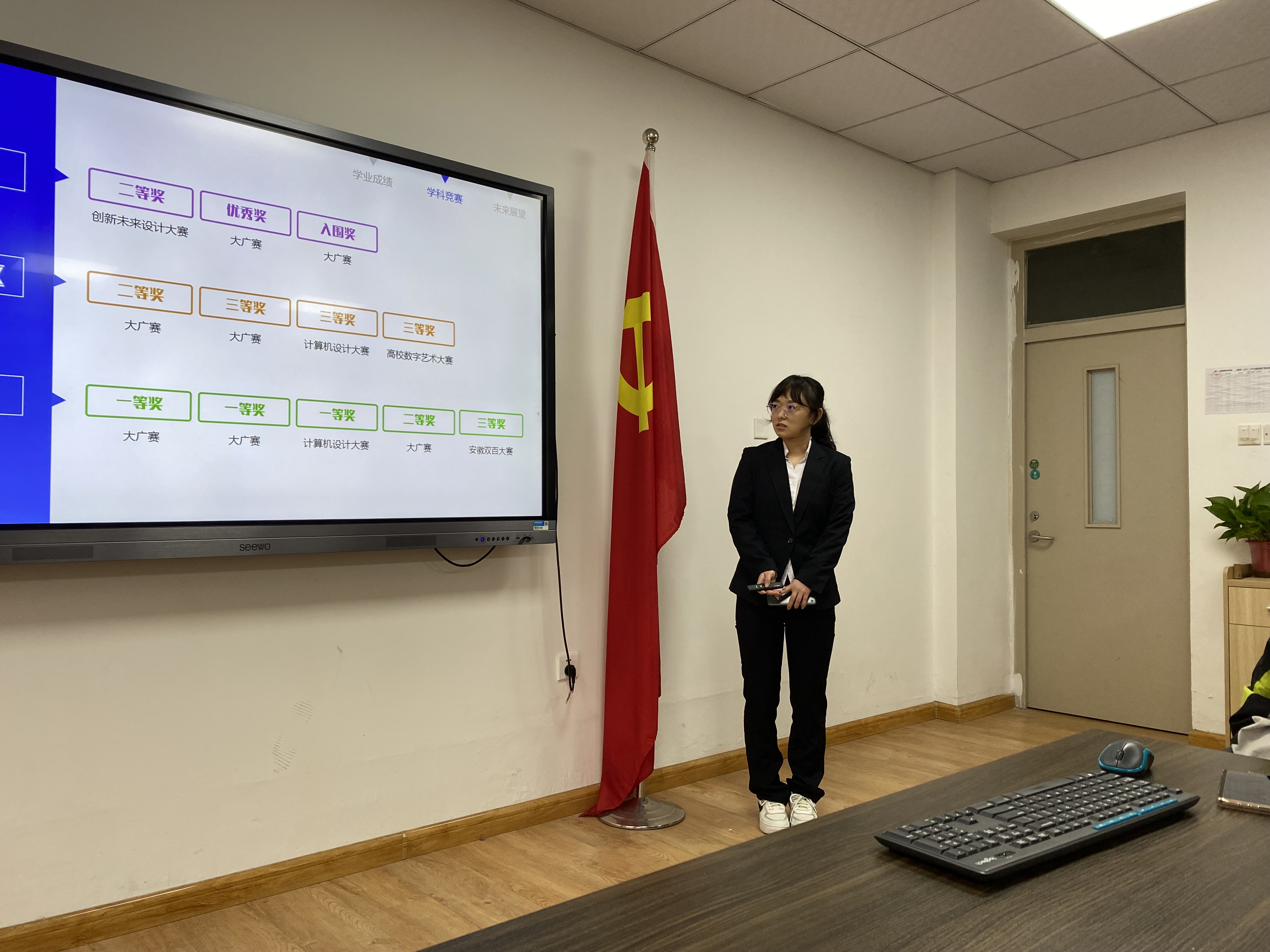 会议伊始,周刘湘提出本次评审会的意义、目的以及相关要求,要求申请的各位同学把握此次机会,在进行PPT汇报的时候充分展示自我,并提醒各新生班学习委员,将会议上优秀学生的学习精神和学习感悟,从会议中带回班级,分享给班级的同学。紧接着,申请国家奖学金的十五位同学依次进行了PPT的汇报,申请的同学们分别从学习收获(见贤思齐,励学敦行)、创新创业(创新创业,笃诚其行)、社会实践(社会公益,一路随行)等三个方面进行汇报。通过各位申请者的展示,可以充分感受他们在学习上的专注严谨,工作上的上认真负责,他们积极的参与学校里外的各项比赛,并且取得优异的成绩。一张张的获奖证书,是他们一段段学习生涯的总结;创新创业是他们响应习近平总书记提出的“创新引领发展的第一动力”号召的证明;投身社会实践,是他们进入社会前的向社会发出属于他们的一道声音。评委们根据国家奖学金评选要求及申请同学所展示的内容,最终评选并确定了本学年学院国家奖学金获得者的名单。