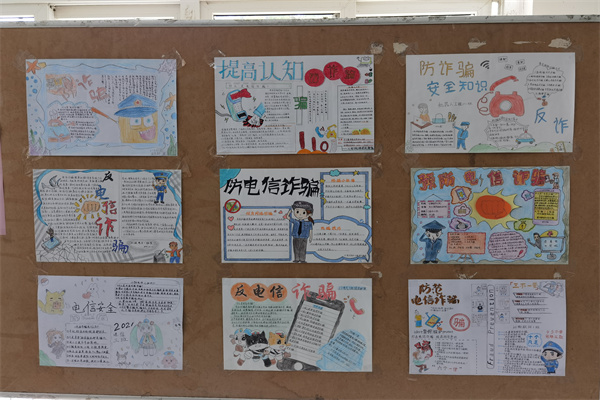 在氛围营造方面,充分利用宣传栏、电子屏、微信公众号等线上、线下宣传媒体,推送“防电诈”相关标语、视频,形成多渠道、多角度、常态化宣传的良好态势,组织各新生班级自行绘制主题手抄报并张贴在教学楼宣传栏,营造浓厚氛围。
