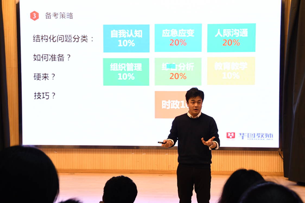华图教育专职教师史幸通过提问的方式,引出教师资格面试的系列话题,并围绕教师资格面试时间、流程、准备方法以及教师考编等相关问题与学生进行全面交流。史幸重点列出教师资格证面试流程,并对试讲环节技巧作重点讲解。尤其针对抽题流程中“教案撰写”这一颇具挑战性部分,提醒学生应在平时加强练习。随后,他还详细介绍了结构化面试、答辩流程,强调在回答结构化问题时,应特别注重应急应变、人际沟通、综合分析。