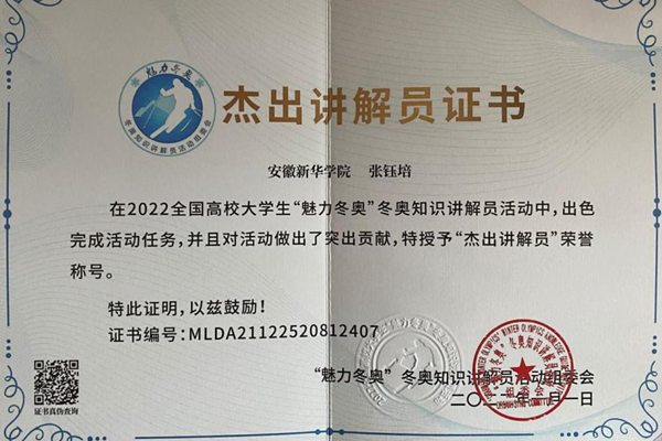 2022年2月将在中国北京举办冬季奥林匹克运动会,筹办北京冬奥会是我国重要历史节点的重大标志性活动,是展现国家形象、促进国家发展、振奋民族精神的重要契机,而2022全国高校大学生“魅力冬奥〞冬奥知识讲解员活动秉着弘扬冬奥精神,传播冬奥知识的目的举办,安徽新华学院药学院21级药学一班张钰培同学通过互联网参加了全国高校大学生“魅力冬奥”冬奥知识讲解员活动,她通过互联网方式进行冬奥会知识讲解传播,并积极弘扬冬奥精神,传播冬奥知识,为冬奥会助力,由此获得了活动组委会颁发的“杰出讲解员”荣誉证书。