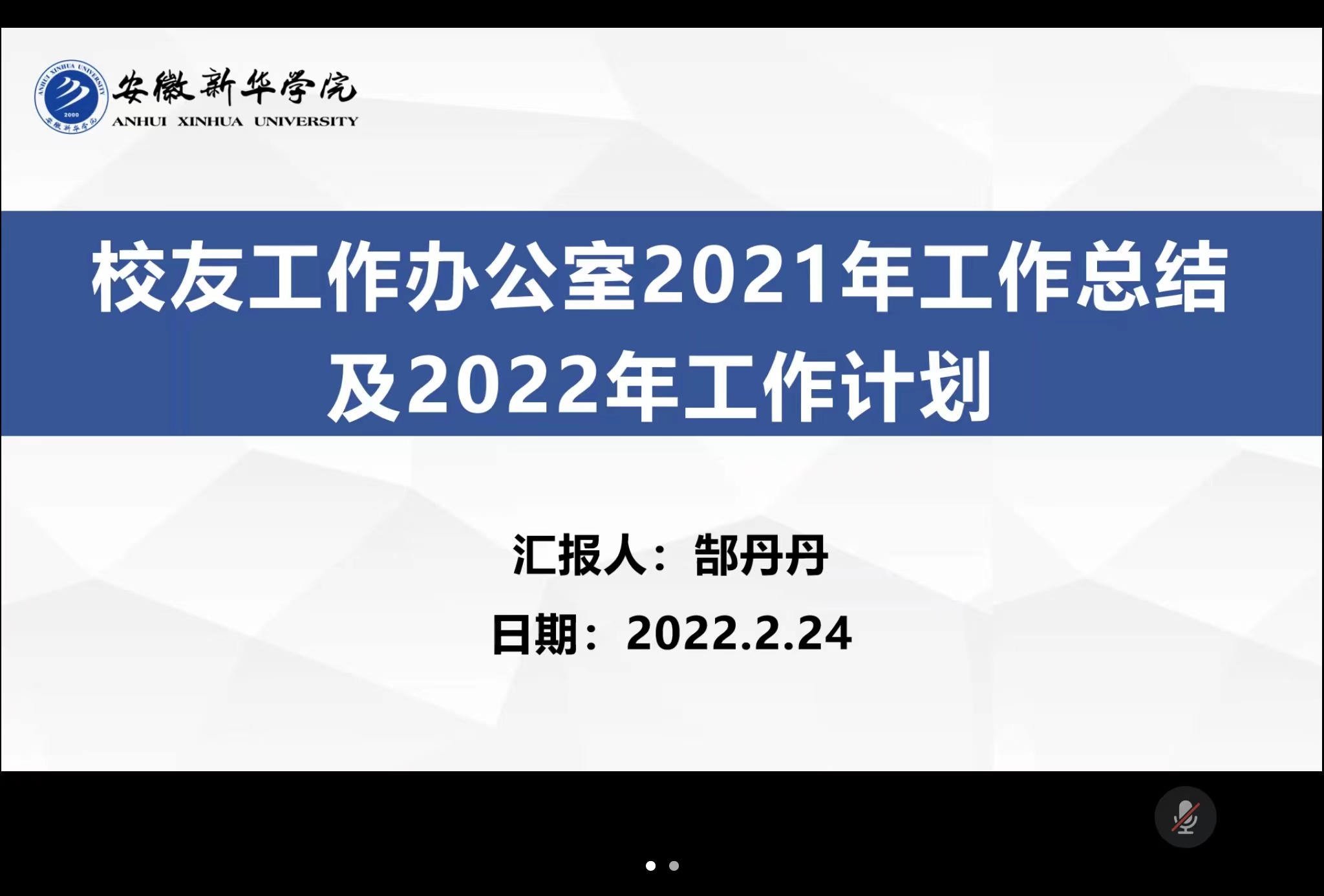 郜丹丹首先表达了对各位校友的热烈欢迎,介绍了本次会议的目的,并代表校友办汇报学校2021年校友工作总结及2022年校友工作计划。随后,上海校友分会、合肥校友分会及江苏校友分会会长依次进行汇报,汇报内容主要围绕地方校友分会2021年工作总结、2022年工作计划、活动开展情况及现阶段存在困难等方面展开。