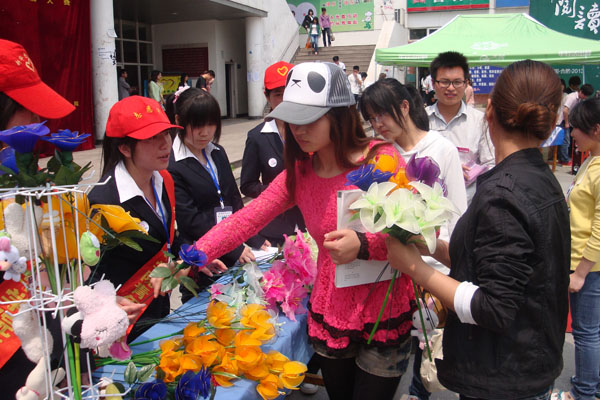 广场上红色的捐款箱投进去的一元承载的是满满的心意。珠花、百合、吉祥物等五颜六色的手工制成品以及泼墨留香的书画吸引了不少同学的围观。活动现场,信息工程学院信息与计算科学(1)班的刘坤金同学买了4束手工花束,他表示,买的人多一点,就可以帮助更多的西部孩子,积少成多,小爱心就可以汇成大的力量。