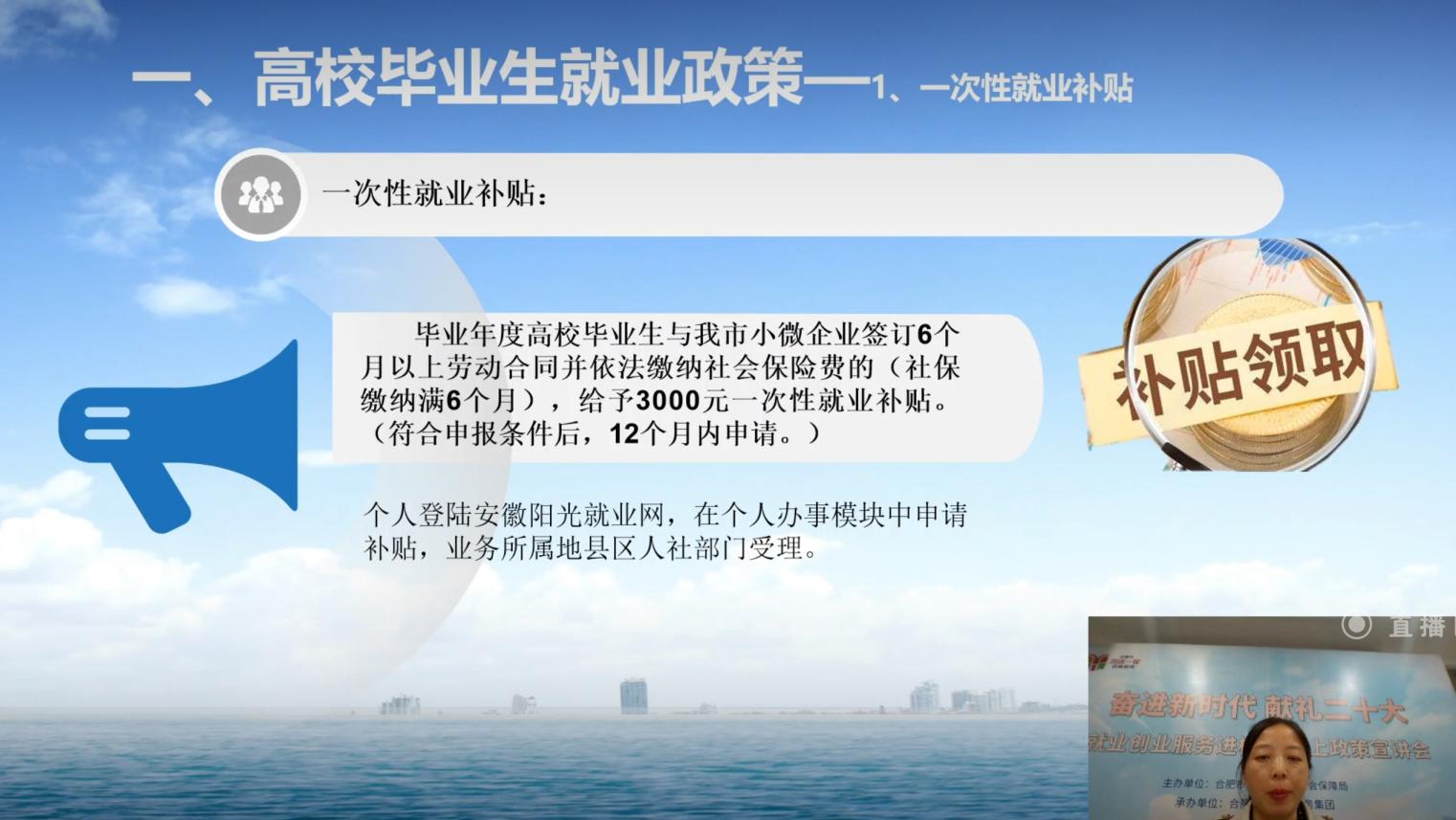 本网讯(通讯员:龚宛琦)为推进2023届毕业生充分就业,为广大毕业生提供高效、便捷、精准的就业创业政策服务,10月12日19:00,我校开展了“奋进新时代,献礼二十大”就业创业政策进校园专题讲座,本次讲座由合肥市人力资源和社会保障局就业促进和失业保险处王梅主任与省“启明星”就业指导专家团成员周虎律师担任主讲,1000余名2023届毕业生在线观看。