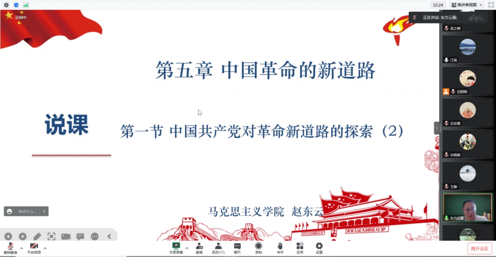 本网讯(通讯员:吴之娴)10月23日下午2时,马克思主义学院组织开展教师教学创新大赛选拔活动。受疫情影响,本次活动线上进行,由教研室主任刘丽娟主持,副院长董丽娟、教研室主任王静、教学秘书章凤萍及各课程组负责人等出席并参与评审。