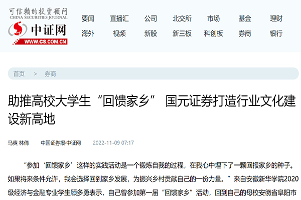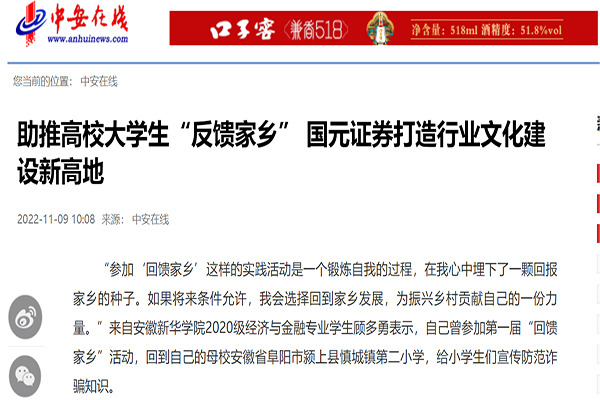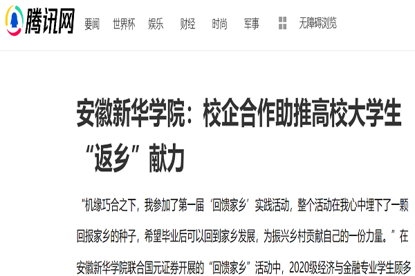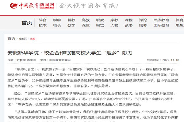 本网讯(通讯员:夏阳)近日,安徽新华学院联合国元证券开展的“回馈家乡”活动引起国内多家主流媒体广泛关注。中国教育新闻网、腾讯网、凤凰网、中证网、中安在线等分别对这一事件进行报道、转载和跟踪访问。