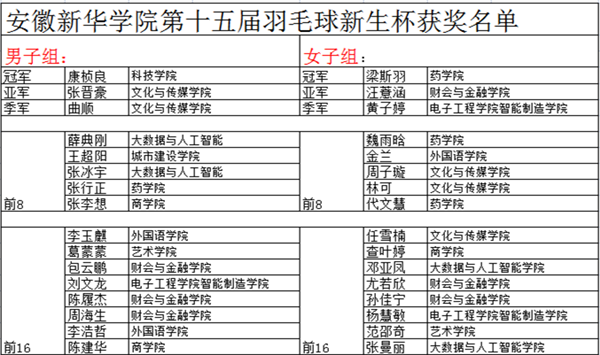 本次比赛丰富了我校学生课余生活,为我校新生羽毛球爱好者提供了展示的舞台,同时增强了各院系之间的交流与联系,充分展现了我校学子积极向上、努力拼搏、不断进取的良好精神风貌。