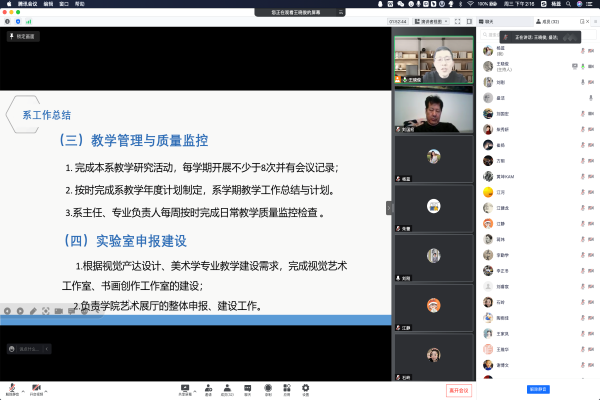 本网讯(通讯员:杨蕊)为进一步提高工作整体效能,总结交流工作经验,12月7日~9日,艺术学院召开美术系、动画系、设计系及表演系2022年度教师工作总结汇报会议。艺术学院院长江河、院长助理刘刚、各系主任及全体教师参加线上汇报会议。